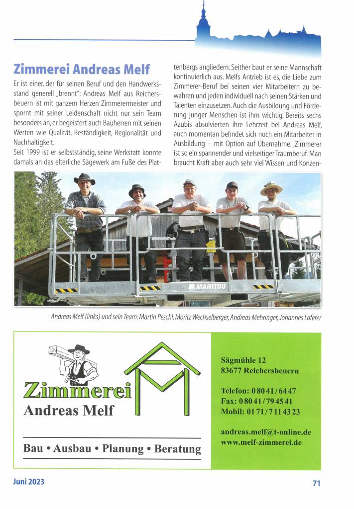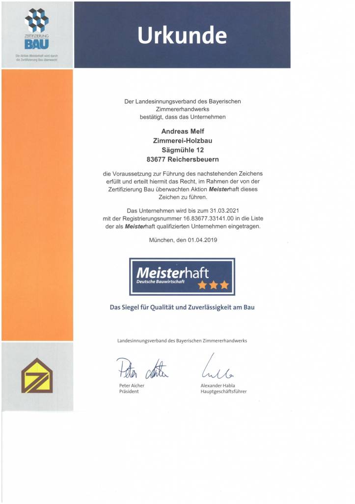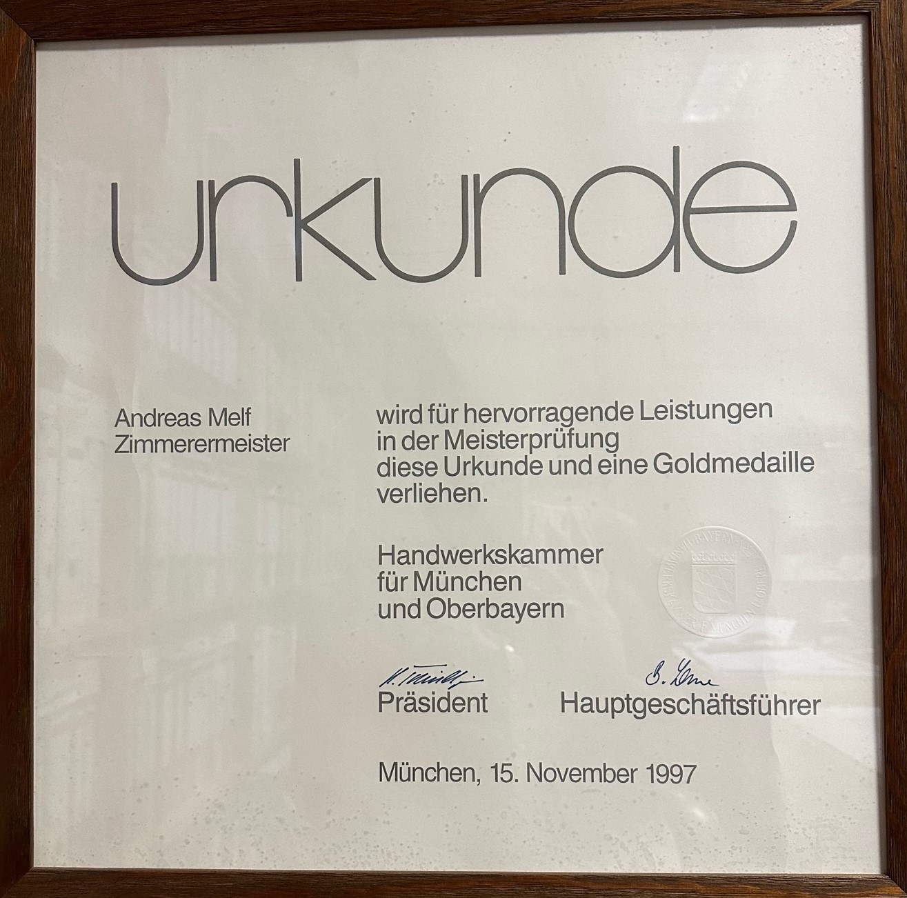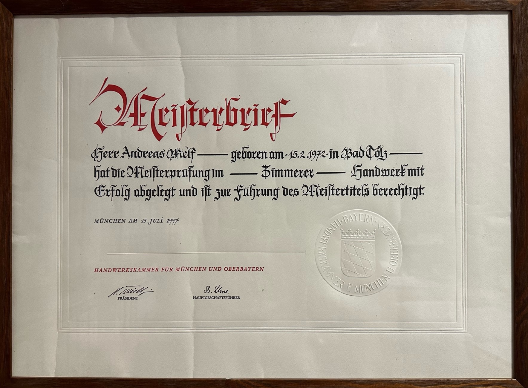 Andreas Melf schloss die Meisterschule am 18.07.1997 erfolgreich ab und trägt seitdem den Titel "Zimmermeister"